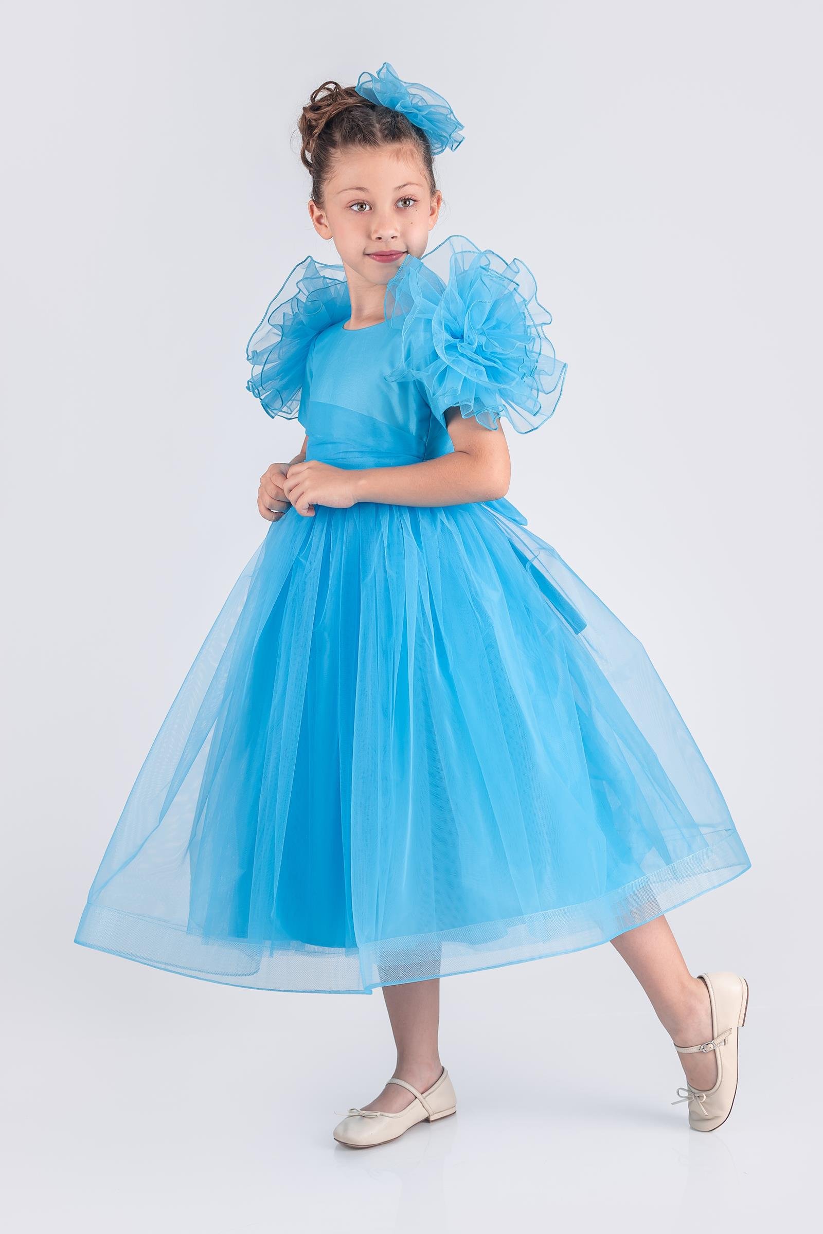 Çiçek Kollu Tüllü Kız Çocuk Abiye Elbise - Mavi