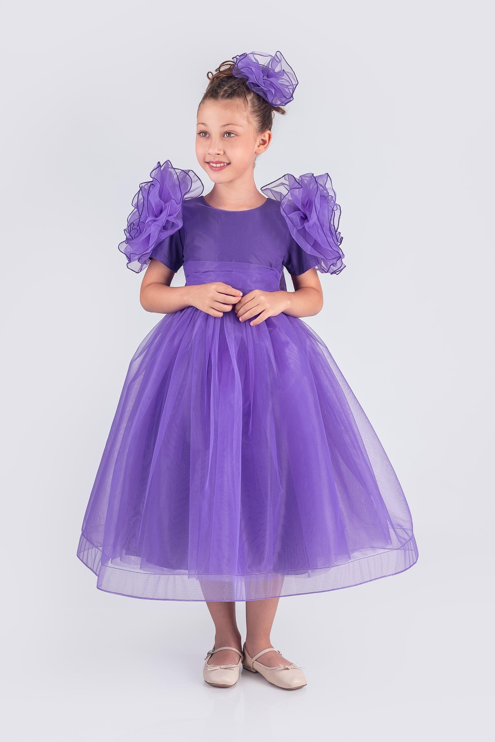 Yaş Aralığı: 5 - 12 yaş Kumaş: Astarlı, çok katmanlı tül Detaylar: Çiçek formunda volan kol tasarımı, belde büyük fiyonk, fermuar kapama Aksesuar: Elbiseyle takım uyumlu tül saç tokası Kullanım Alanları: Doğum günü, düğün, bayram, özel davet ve sahne gösterileri