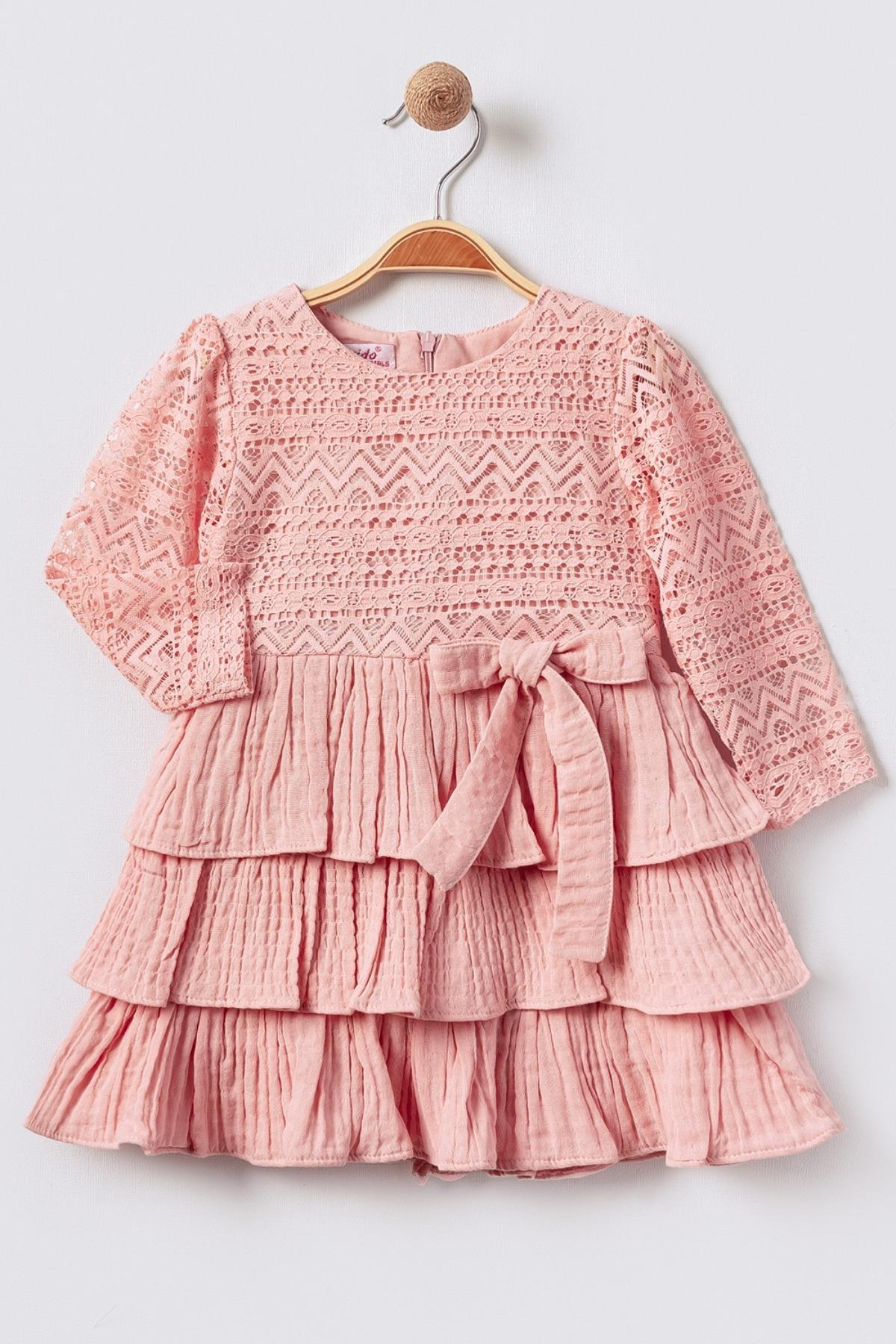 Bu zarif elbise, müslin pamuk kumaştan üretilmiştir. Üst bedeni şık nakış detayları ile süslenmiş olup, uzun kolları dantel desenleriyle tamamlanmıştır. Bel kısmında zarif bir fiyonk detayı bulunan bu elbise, kat kat etek tasarımıyla hareketli ve şık bir görünüm sunar. Günlük kullanımda veya özel günlerde rahatlıkla tercih edilebilir.