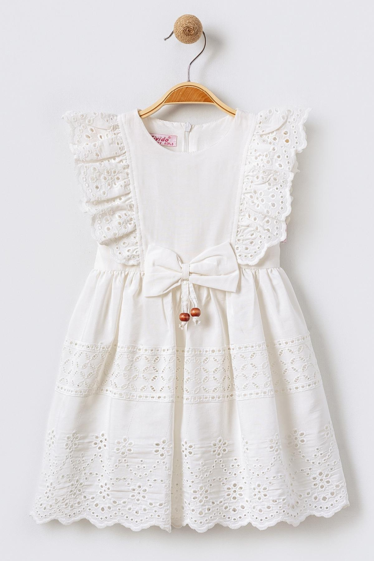Kurdeleli Fisto Omuzlu Kolsuz Kız Çocuk Brode Elbise - Ekru