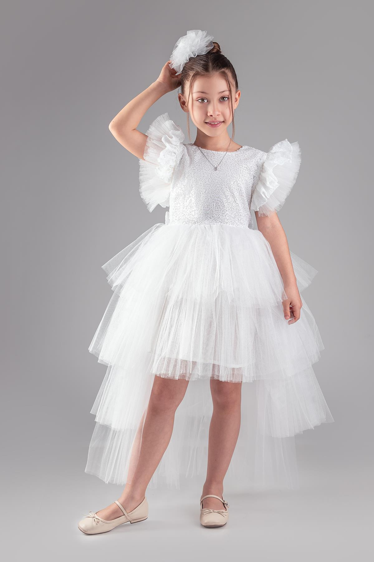 Küçük prensesler için tasarlanan bu göz alıcı abiye elbise, şıklığın ve zarafetin mükemmel bir birleşimini sunuyor. Üst kısmındaki ışıltılı payet detayları, her adımda parıldayarak büyüleyici bir görünüm kazandırırken, kat kat tül etekleri elbiseye hacim ve hareket katar. Omuzlardaki kabarık tül detayları ise tasarıma masalsı bir dokunuş ekler.