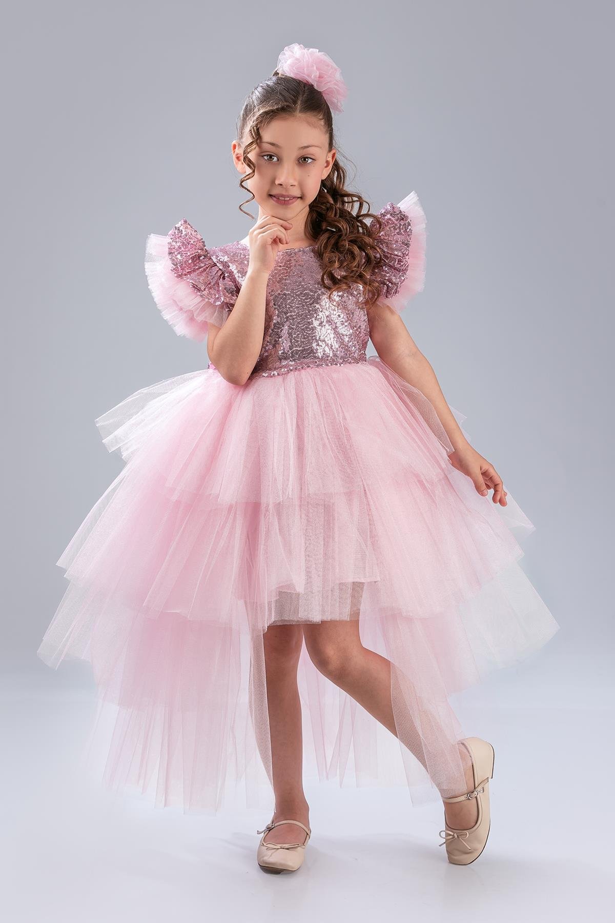 Pul Payet Kuyruklu Kız Çocuk Abiye Elbise - Pembe
