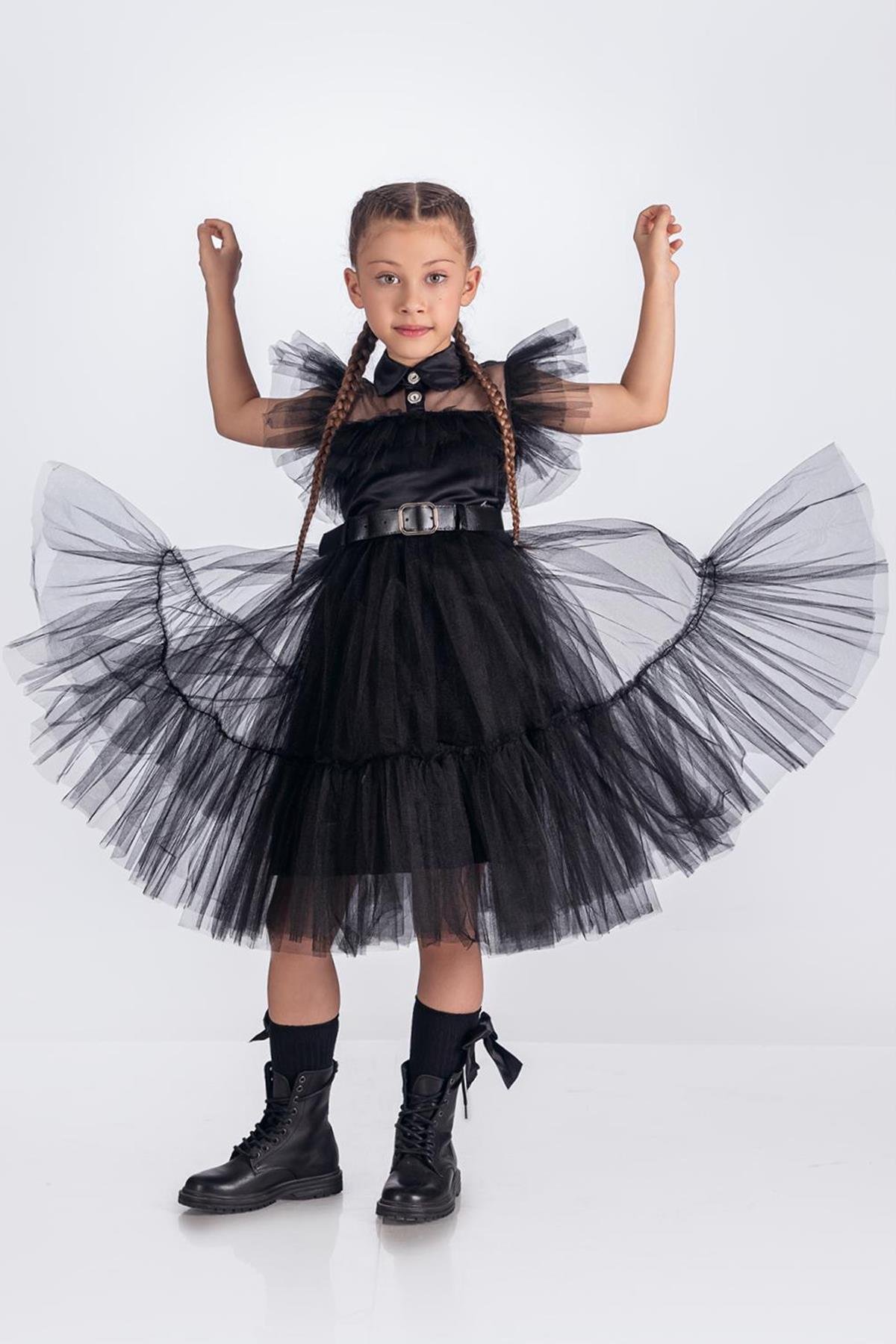 Ürün tam kalıptır, yaşa göre beden seçimi yapabilirsiniz. Wednesday Addams karakterinin ikonik ve karanlık stiline uygun bir seçimdir.Elbisenin yaka detayı, fırfırlı kabarık tül kolları ve kemeri ile özel kutlamalar, okul baloları, fotoğraf çekimleri, parti gibi özel günlerde farkınızı ortaya koyar..Tokası ve kemeri ile beraber gönderilmektedir.